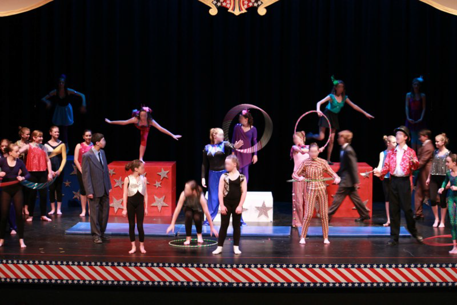 High-impact, circus-inspired set design and scenic art brought this classic to life, including sturdy plinths to hold performers